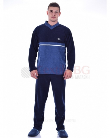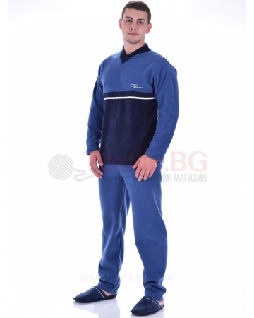 Топла мъжка пижама от хавлия предпочитана през зимния сезон. Двуцветна комбинация от блуза с прикачена платка с декоративна лента и панталон с ластична талия.