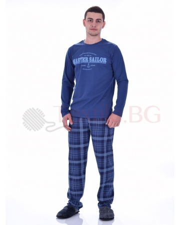Мъжка пижама с дълъг ръкав. Блуза едноцветна със ситопечат, прав модел, обло деколте с щрих. Панталон на карета, свободна и удобна кройка.