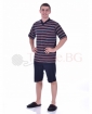 Мъжка пижама от две части. Блуза с къс ръкав изработена от памучно трико райета с веобразно деколте. Едноцветни къси панталони съчетани с блузата. Моделът се предлага в размери до 4XL.